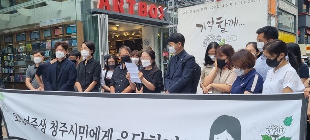 22일 피해자 유족들은 충북 청주 성안길 사거리 '오창 여중생 사망 100일 추모제' 헌화공간 앞에서 기자회견을 열고 딸의 유서 내용을 공개했다.