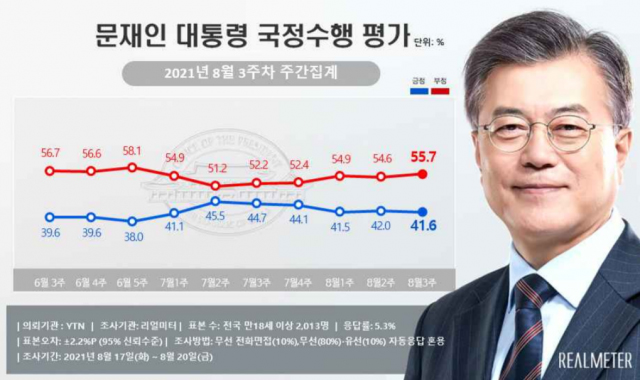 리얼미터가 이날 발표한 8월 3주차 주간집계 결과 문 대통령 지지율은 41.6%였다. 국정수행 부정평가는 55.7%였다. 지난주 대비 지지율은 0.4%포인트(p) 떨어졌고 부정평가는 1.1%p 높아졌다.