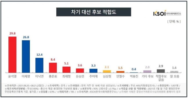 한국사회여론연구소(KSOI)가 23일 발표한 여론조사(TBS 의뢰로 지난 20, 21일 전국 만 18세 이상 1007명을 대상으로 실시) 결과 윤 전 총장은 29.8%, 이 지사는 26.8%를 기록했다. 윤 전 총장은 전주대비 0.8%포인트(p) 하락한 반면 이 지사는 0.6%p 상승했다.