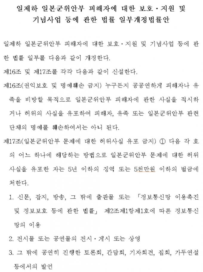 이 법안에 따르면 사실적시라 하더라도 위안부 유족 외에도 관련 단체 및 관련자의 명예를 훼손할 경우 처벌받게 된다. 정보통신망의 이용, 토론회, 간담회, 기자회견, 집회, 가두연설 등에서 관련 발언을 해도 처벌받는다.