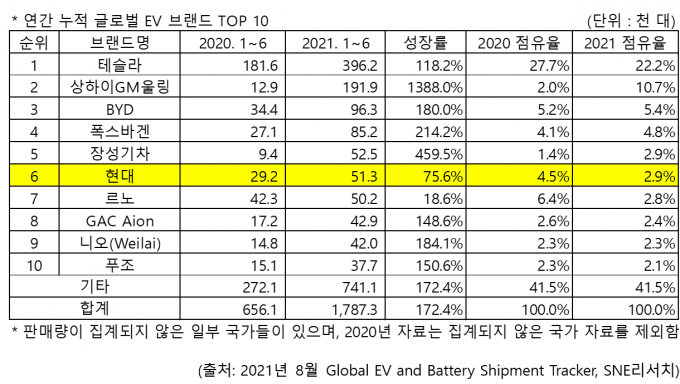 EV 부문에서는 테슬라가 모델 3와 모델 Y 판매 급증에 힘입어 전체 판매량이 두 배 이상 증가하면서 1위 자리를 굳건히 지켰다. 중국계인 상하이GM울링과 BYD, 장성기차, 니오(Weilai)는 자국 시장 회복에 힘입어 전체 시장 성장세를 주도했다.