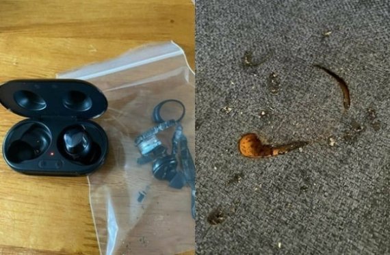 해당 글에는 산산조각난 이어폰과 폭발로 타들어 간 것으로 추정되는 섬유 사진이 첨부됐다. 작성자의 설명대로 이어폰 인이어 부분은 멀쩡하지만, 바깥으로 노출되는 부분은 불에 타 내부가 다 드러난 모습이다. 글 속 제품은 '갤럭시 버즈 플러스'로 추정된다.