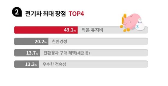 전기차의 최대 장점을 묻자 적은 유지비(43.1%), 친환경성(20.2%), 친환경차 구매 혜택(13.7%), 우수한 정숙성(13.3%) 등의 순으로 답했다.