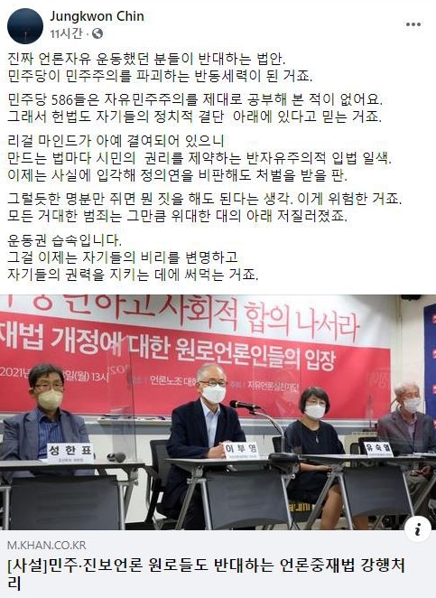 진중권 전 동양대 교수는 민주당을 "민주주의를 파괴하는 반동세력이 됐다"고 성토했다. 진 전 교수는 전날 페이스북에 군부 정권 시절 자유 언론 수호 투쟁을 벌였던 원로 언론인들이 언론중재법 개정에 대해 우려를 표명했다는 기사를 링크한 뒤 "진짜 언론자유 운동했던 분들이 반대하는 법안"이라고 적었다.