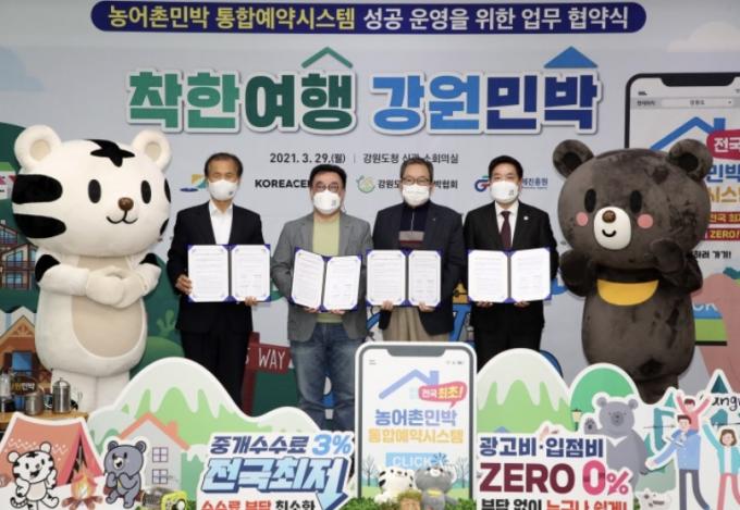 ▲최문순 강원지사(왼쪽)가 지난 3월 29일 농어촌민박 통합예약시스템 구축을 위한 업무 협약을 한 후 기념촬영을 하고 있다. [강원도 제공]