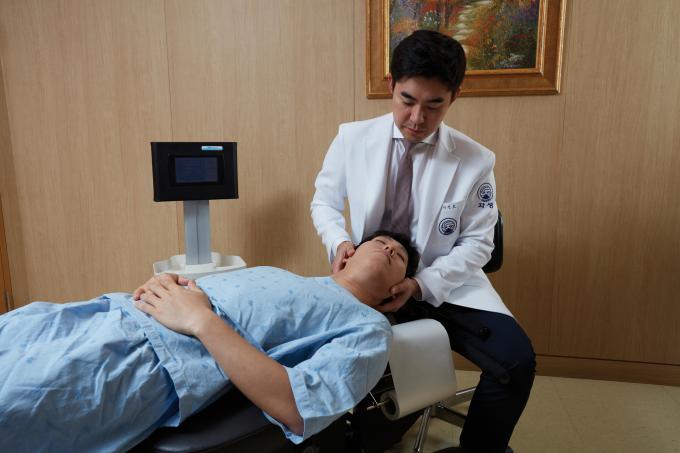 ▲ 자생한방병원 이진호 병원장이 목 통증 환자에게 추나요법을 하고 있다. [자생한방병원 제공]