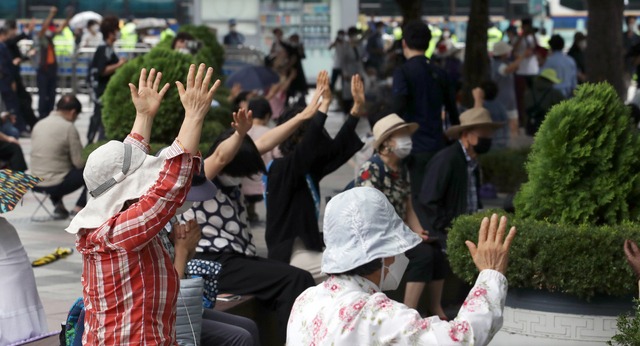 ▲ 대면 예배 강행으로 시설 폐쇄 처분을 받은 사랑제일교회 교인들이 지난 22일 서울 종로구 동화면세점 앞에서 휴대전화로 전광훈 목사의 온라인 생중계를 보며 예배에 참여하고 있다. [뉴시스]