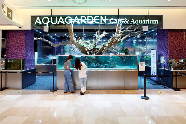 아쿠아가든은 지난 19일 기존 쇼핑몰 지하 1층 푸드코트 공간을 탈바꿈해 선보인 수족관카페다. 물속 풍경의 아름다움을 인테리어에 접목한 '아쿠아가든'은 관상어와 수초들을 관람하며 차를 즐길 수 있다. 또 물을 오래 바라보며 마음의 평안을 갖는 휴식문화인 '물멍'도 가능하다.