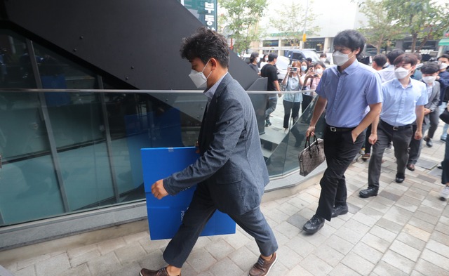 ▲ 25일 서울 영등포구 머지플러스 사무실에 서울경찰청 금융범죄수사대 수사관들이 들어가고 있다. [뉴시스]