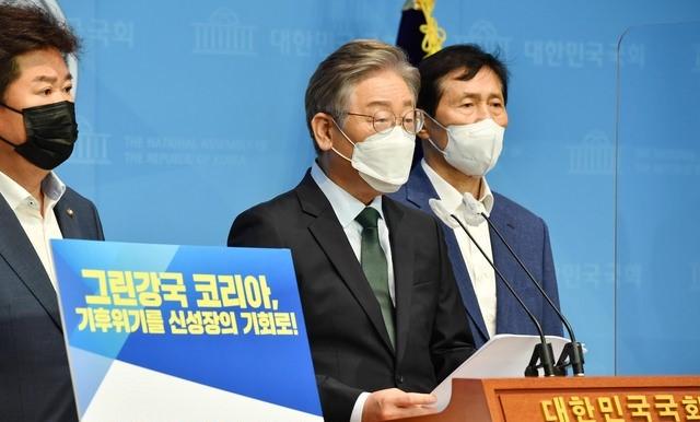 ▲더불어민주당 이재명 대선 경선후보가 26일 국회 소통관에서 '그린강국 코리아, 기후위기를 신성장의 기회로' 공약 발표 기자회견을 하고 있다. [뉴시스]