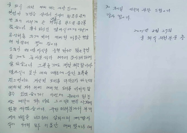 ▲ 국민의힘 윤희숙 의원이 공개한 부친의 자필 편지.