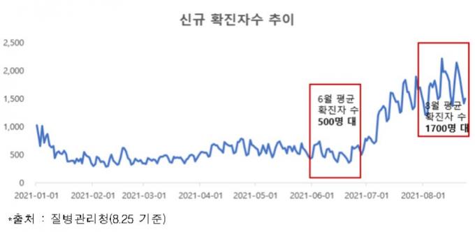 이에 한경연은 코로나19 확산세가 지속되는 상황에서 고용 불안은 더 가중될 수밖에 없다고 지적했다. 정부가 코로나19 장기화를 이유로 지원금 연장조치를 취한 6월 평균 확진자수는 554명이었지만 이번 달은 1724명에 이르고 있다.