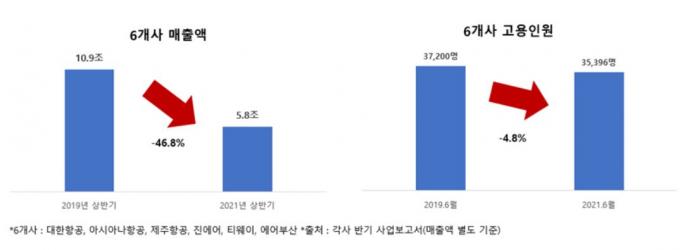 항공업의 경우 올 상반기 6개 사 매출액이 코로나19 이전인 2019년 상반기 대비 46.8% 감소했지만, 고용은 4.8% 주는 데 그쳤다. 고용유지 지원금의 역할이 컸다는 것이 한경연의 분석이다.