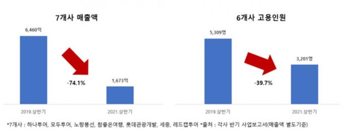 여행업 대표 7개 사도 상반기 매출액은 2019년 상반기 대비 74.1% 감소했고, 호텔 신사업으로 채용을 확대한 롯데관광개발을 제외한 6개 사의 고용인원은 39.7% 줄었다.