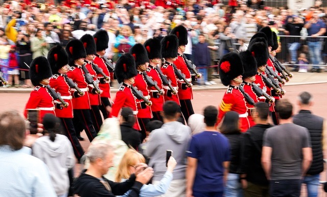 ▲ 24일 영국 런던 버킹엄궁에서 시민들이 근위병 교대식을 지켜보고 있다. 코로나19로 중단됐던 교대식은 이날 재개됐다. [AP뉴시스]
