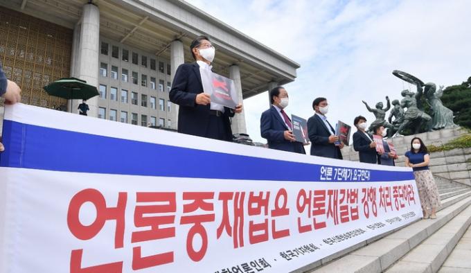 한국신문협회·한국신문방송편집인협회·한국기자협회·한국여기자협회·한국인터넷신문협회·관훈클럽·대한언론인회는 이날 서울 여의도 국회에서 기자회견을 갖고 "언론중재법 개정안의 국회 본회의 강행 처리를 즉각 중단하라"고 밝혔다. 또 "문재인 대통령은 개정안이 국회를 통과해 정부로 이송될 경우 거부권을 행사하라"고 요구했다.