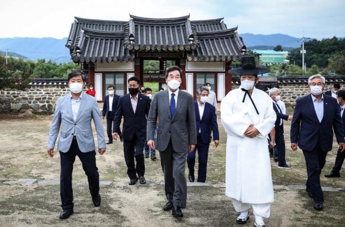 ▲ 더불어민주당 이낙연 대선 경선 후보(가운데)가 지난 29일 충남 논산시 돈암서원을 방문하고 있다. (사진=이낙연 캠프 제공)