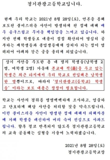 그러면서 "학교는 사안의 경위를 명명백백하게 조사하고 엄중하고 단호하게 해당 사안을 처리할 것을 약속드린다"며 "불미스러운 사안이 발생한 점에 대해 피해자분께 가해 학생을 대신해 머리 숙여 진심으로 사과드린다"고 했다.