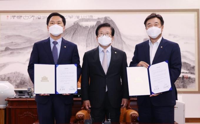 ▲ 더불어민주당 윤호중(오른쪽), 국민의힘 김기현 원내대표(왼쪽)가 지난달 31일 서울 여의도 국회에서 언론중재법 개정안 처리 협의체 구성 등의 내용이 담긴 합의문을 들고 기념촬영을 하고 있다. 가운데는 박병석 국회의장. [뉴시스]