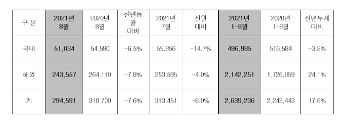 1일 현대차에 따르면 국내 판매는 6.5% 감소한 5만1034대, 해외 판매는 7.8% 감소한 24만3557대를 각각 나타냈다.
