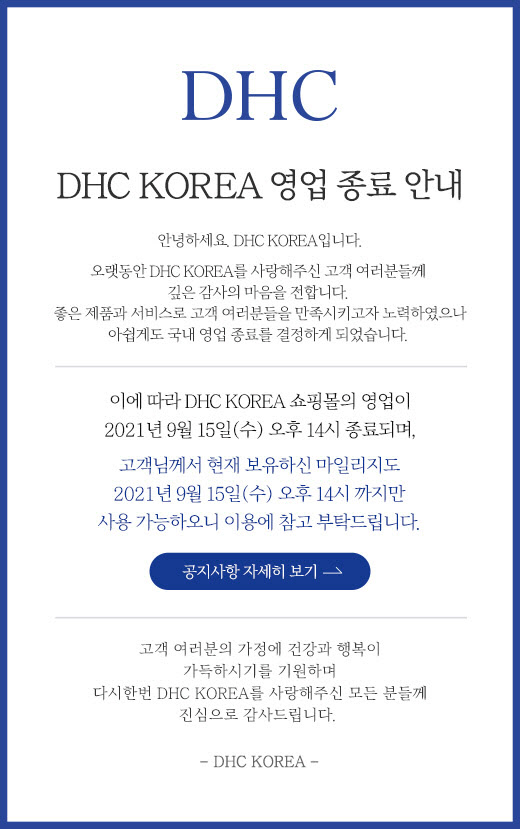 1일 DHC코리아는 공식 홈페이지를 통해 "좋은 제품과 서비스로 고객 여러분들을 만족시키고자 노력했으나 아쉽게도 국내 영업 종료를 결정하게 됐다"고 밝혔다.