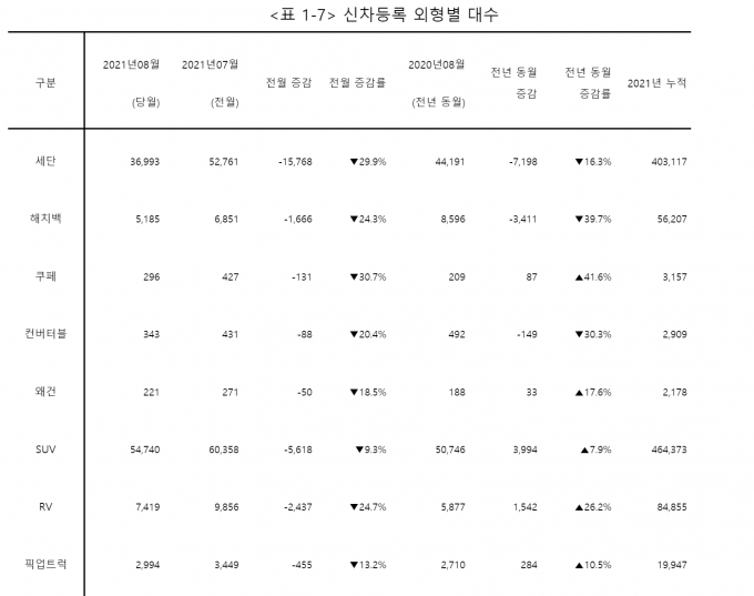 외형별 대수는 SUV가 5만4740대로 전년 동월에 비해 7.9% 성장하며 1위를 차지했다. 그 뒤를 이은 세단은 3만6993대로 전년 동월보다 16.3%나 고꾸라졌다.