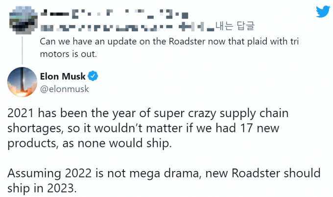 로이터 통신 등 외신에 따르면 일론 머스크 테슬라 최고경영자(CEO)는 1일(현지시간) 트위터에 "테슬라가 정신 나간 수준의 공급망 부족 현상에 직면하고 있다"면서 "내년이 대단한 반전이 없다고 가정한다면 신형 로드스터는 2023년에 출시될 것"이라고 적었다.