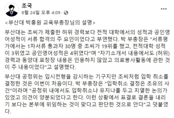 조 전 장관 딸 조민 씨 성적 문제도 '양심 불량' 논란을 불렀다. 부산대는 조 씨 입학을 취소하며 '조 씨의 대학성적이 3등'이라고 발표했다가 착오였다고 인정했다. 조 씨 실제 대학 성적은 어머니 정경심 동양대 교수 1심 판결문에 따르면 30명 중 24등이다. 부산대 자체 검토에서도 24등이 맞는 것으로 나타났다.