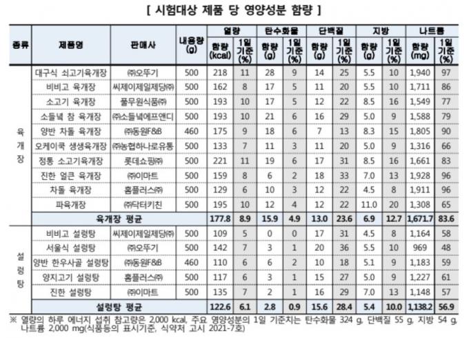 ▲ 육개장·설렁탕 15개 제품 영양성분 비교 [한국소비자원 자료]