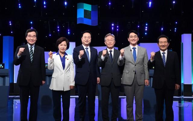 ▲더불어민주당 대선 경선후보인 이낙연(왼쪽부터), 추미애, 김두관, 이재명, 박용진, 정세균 후보가 지난달 11일 서울 여의도 KBS에서 열린 본경선 3차 TV 토론회에 앞서 기념촬영하고 있다. [뉴시스]