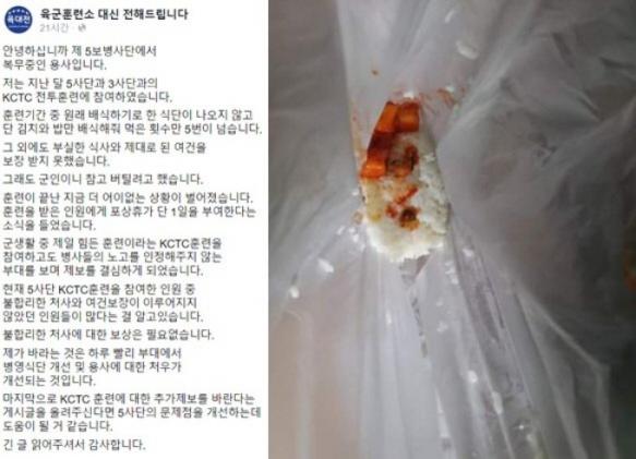 제보자는 "지난달 5사단과 3사단의 KCTC 전투훈련에 참가했을 때 찍은 사진"이라며 "이렇게 김치와 밥만 배식해 먹은 게 5번이 넘는다"고 말했다.
