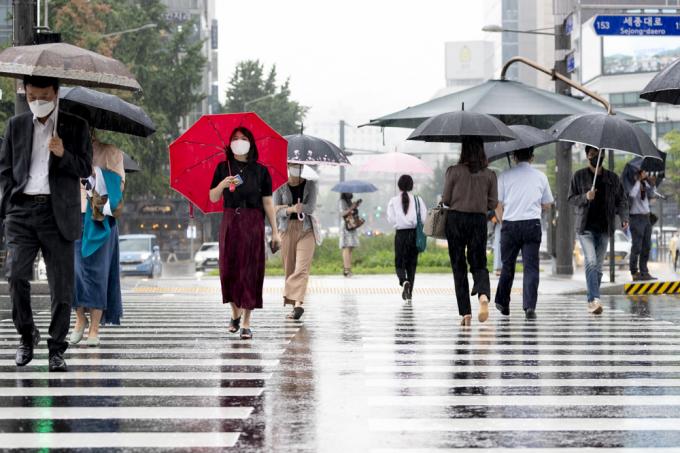 ▲ 지난달 31일 서울 광화문 네거리에서 시민들이 우산을 쓴 채 횡단보도를 건너고 있다. [문재원 기자]