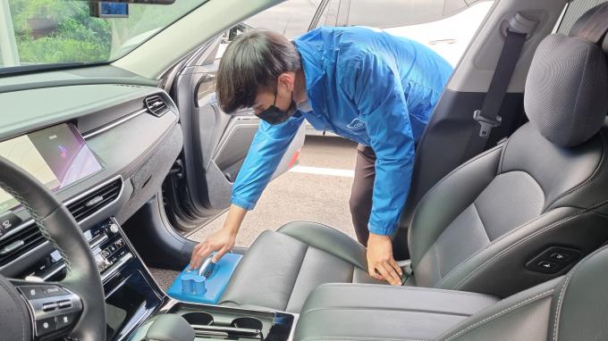 ▲ 기아 정비 협력사인 오토큐에서 차량 실내 공기케어를 위해 케어포그 서비스를 진행하고 있는 모습. [기아 제공]