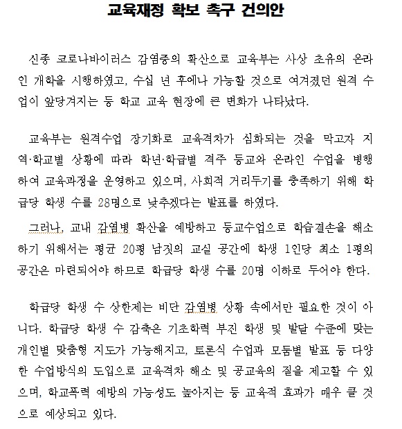 도 의회는 건의안에서 "코로나19 시대 학교방역과 교육격차 및 학습결손 문제를 해결하고 학습권 보장과 공교육의 질 제고를 위해 전국 초·중·고 학급당 학생수 20명 상한제를 도입하고, 그에 맞는 신규 교원 확보 및 학교운영비, 교원인건비 등 교육재정 확충을 통해 교육경쟁력을 강화할 것을 촉구한다"고 밝혔다.