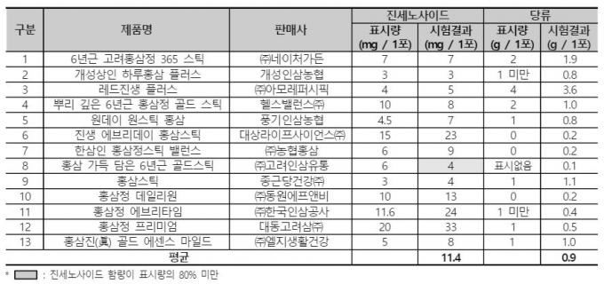스틱 1포당 진세노사이드 함량을 조사한 결과, 13개 제품 건강기능식품 일일섭취량 기준(3mg 이상)을 충족했다. 그러나 제품별 함량은 최대 11배 차이나는 것으로 나타났다.
