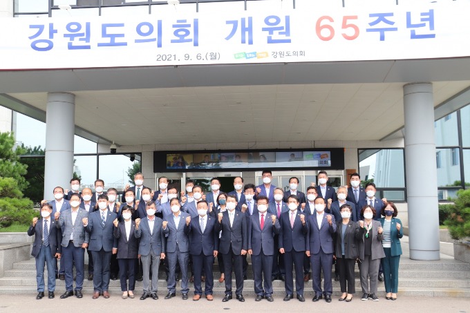 ▲ 6일 강원도의회 개원 65주년을 기념해 도의원들이  도의회 앞에서 기념촬영을 하고 있다. [박에스더 기자]