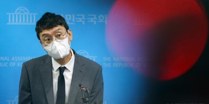 ▲ 국민의힘 김웅 의원이 8일 서울 여의도 국회 소통관에서 '윤석열 검찰 고발 사주' 의혹 관련 기자회견 후 취재진 질문에 답변하고 있다. [뉴시스]