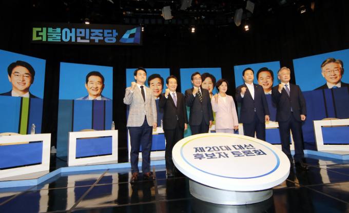 ▲ 더불어민주당 대선 경선 후보들이 지난 7일 대구 수성구 TBC에서 열린 제20대 대통령선거 경선 후보 토론회에 앞서 기념촬영을 하고 있다. 왼쪽부터 박용진, 정세균, 이낙연, 추미애, 김두관, 이재명 후보. [뉴시스]