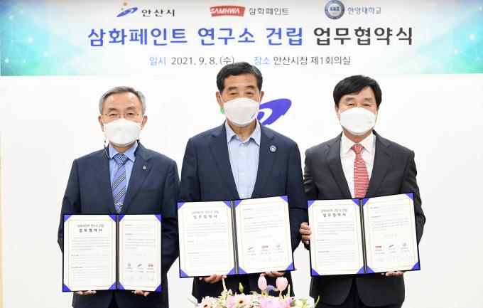 윤화섭 안산시장은 8일 시청에서 류기붕 삼화페인트 대표이사, 김우승 한양대 총장과 삼화페인트 연구소 건립을 위한 업무협약을 체결했다.