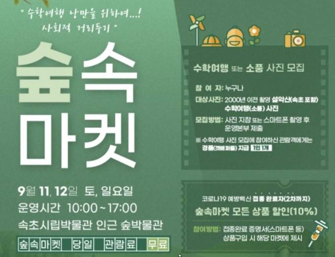 속초시립박물관은 오는 11일부터 12일까지 이틀간 수학여행 낭만을 위한 '사회적 거리두기 숲속 마켓'을 박물관 인근 숲박물관 내에서 개최한다고 밝혔다.