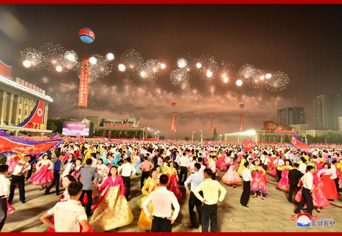 김정은이 떠나고 김일성광장에 남은 주민들은 예전처럼 불꽃놀이 축포 속에서 덩실덩실 춤을 추며 놀았다.