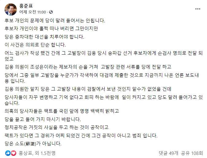 洪 "후보 개인 문제에 당 말려들어선 안돼" 선긋기