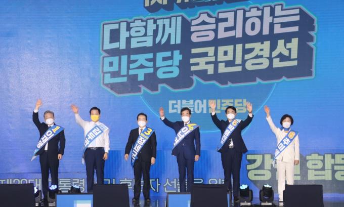 12일 오후 강원도 원주시 오크밸리 리조트 컨벤션홀에서 열린 더불어민주당 대선 경선 후보자 합동연설회에서 이재명(왼쪽부터), 김두관, 정세균, 이낙연, 박용진, 추미애 후보가 포즈를 취하고 있다.