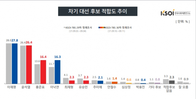 한국사회여론연구소(KSOI)가 13일 발표한 여론조사(TBS 의뢰로 지난 10, 11일 전국 만 18세 이상 1004명 대상 실시) 결과, 이 지사는 27.8%, 윤 전 총장은 26.4%를 얻어 초접전 양상을 보였다. 지난주 조사때보다 이 지사는 0.2%포인트(p) 하락했고 윤 전 총장은 같았다.(표본오차 95% 신뢰수준에 ±3.1%p)