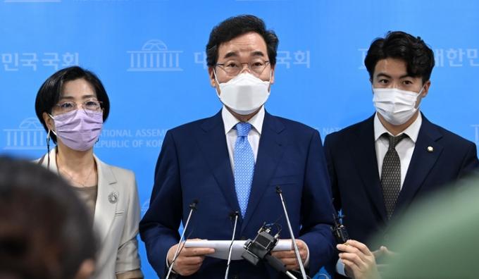 ▲ 더불어민주당 이낙연 대선 경선후보(가운데)가 13일 오전 서울 여의도 국회 소통관에서 저출산 공약 발표 기자회견을 마친 후 취재진과 질의응답을 하고 있다. [뉴시스]