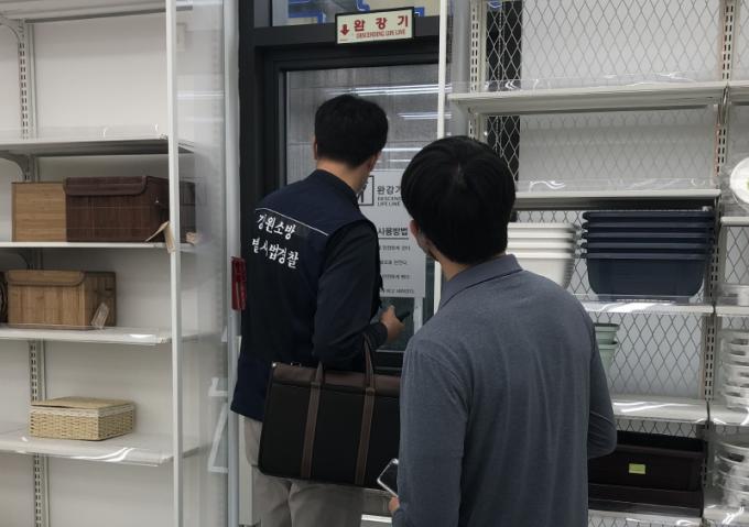 ▲ 강원도소방본부가 대형 판매시설의 비상구 유지·관리실태를 살펴보고 있다. [강원도소방본부 제공]