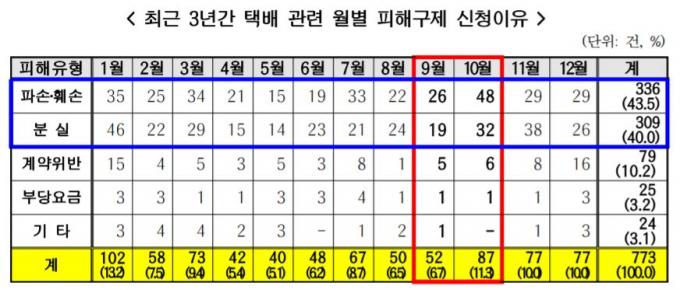 소비자원은 특히 택배 서비스 이용이 집중되는 9~10월 추석 연휴에 파손·훼손 관련 사고가 많이 발생한 것으로 나타났다. 대표적인 소비자피해 사례는 운송물 파손・훼손, 분실, 배송지연, 오배송 등이었다.