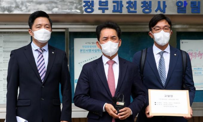 ▲ 윤석열 전 검찰총장 캠프 기획실장 겸 특별위원인 박민식 전 의원(가운데)이 13일 경기 과천시 정부과천청사 고위공직자범죄수사처에 박지원 국정원장과 고발사주 의혹 제보자 조성은씨에 대한 고발장을 접수하기 위해 변호인들과 함께 들어가고 있다. [뉴시스]