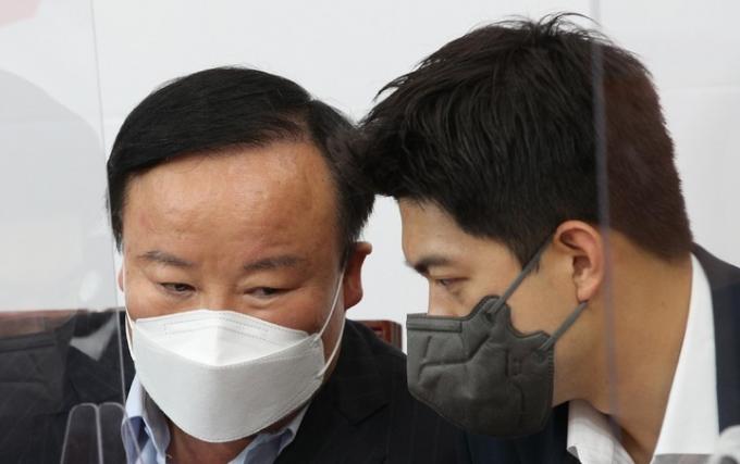 ▲ 국민의힘 공명선거추진단 단장을 맡은 김재원 최고위원(왼쪽)이 지난 9일 서울 여의도 국회에서 열린 최고위원회의에서 김용태 최고위원과 대화하고 있다. [뉴시스]