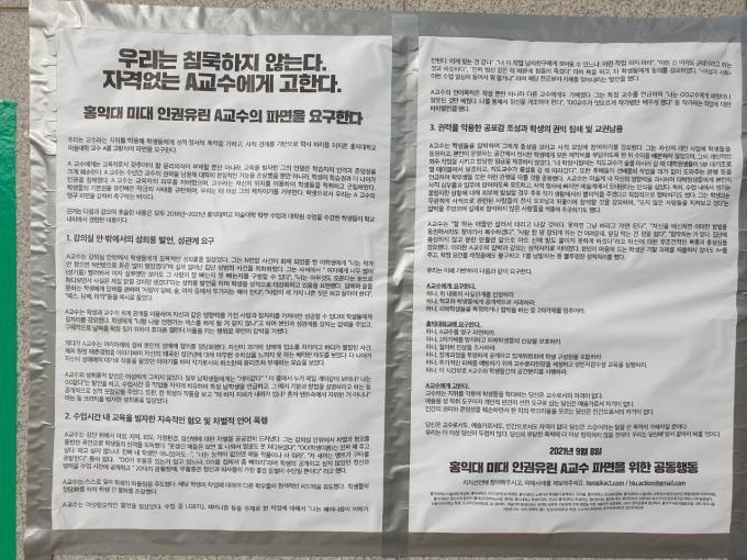 홍익대 미대 학생회 등 17개 단체가 모인 '홍익대 미대 인권유린 A 교수 파면을 위한 공동행동'(공동행동)은 지난 8일 서울 마포구 홍익대 정문에서 기자회견을 열고 "미대 A 교수에 대한 조속한 파면 및 피해자 보호조치를 요구한다"고 밝혔다. 이들에 따르면 A 교수는 학생들에게 성관계를 요구하고 성적 수치심을 느끼게 하는 발언을 서슴지 않았다.